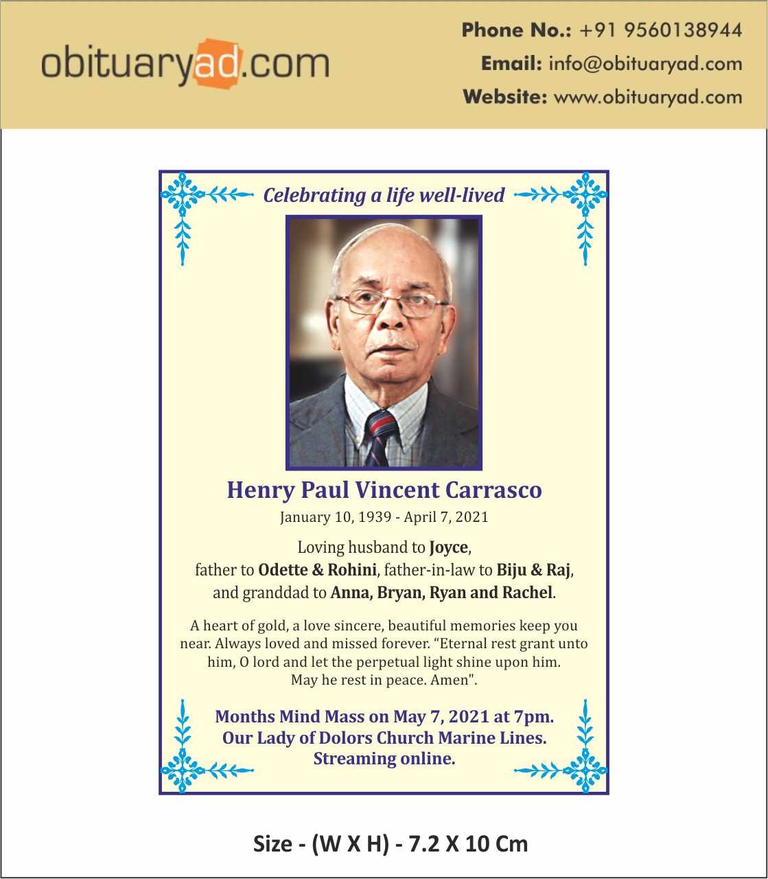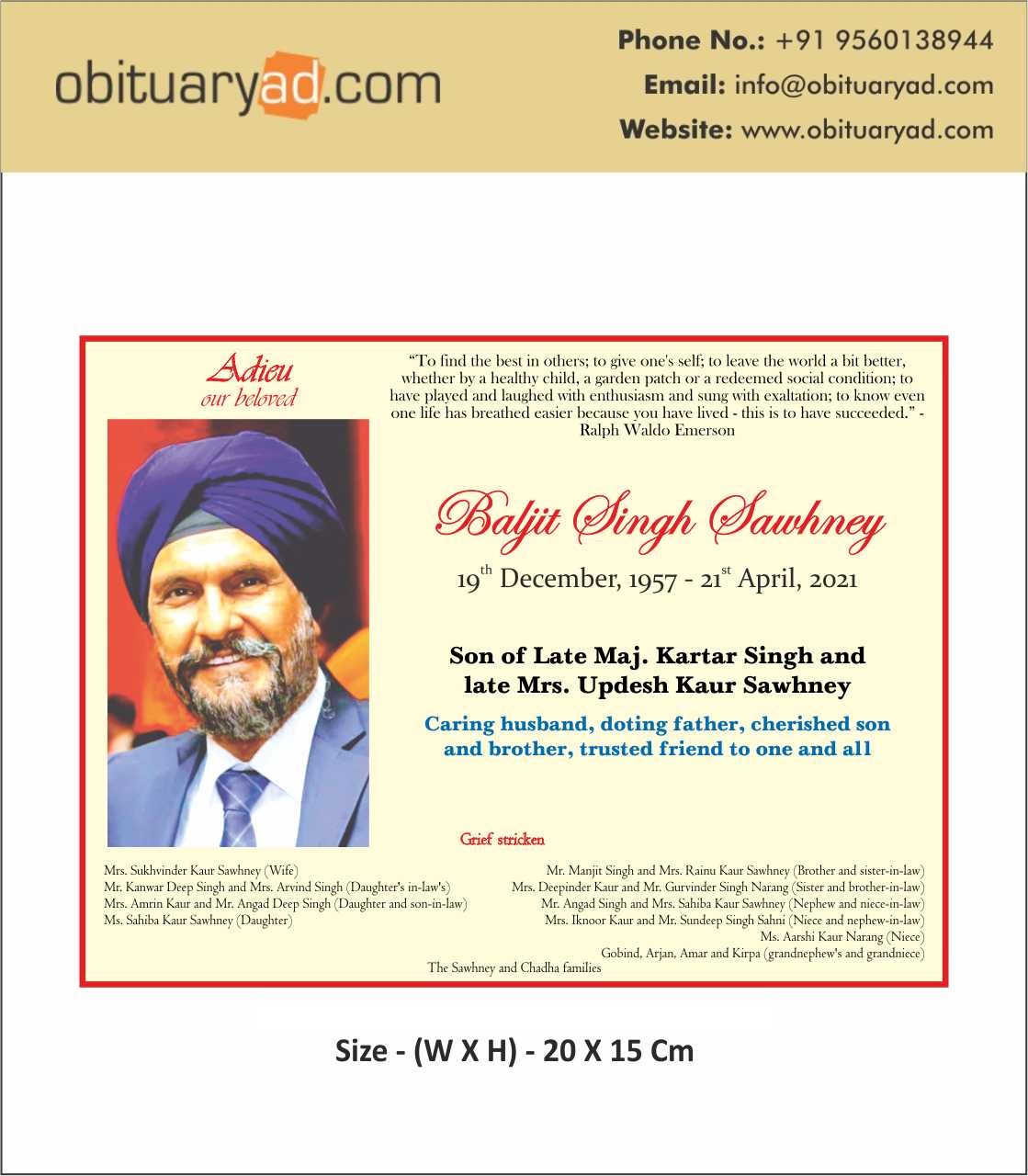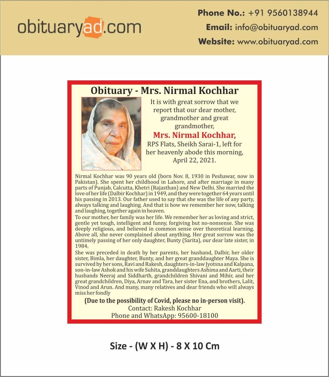 Losing a loved one is an irreplaceable loss that leaves behind deep emotions and memories. ObituaryAd.com offers a compassionate and convenient way to honour your dear departed by placing obituary ads in The Times of India, Mumbai and other leading newspapers.