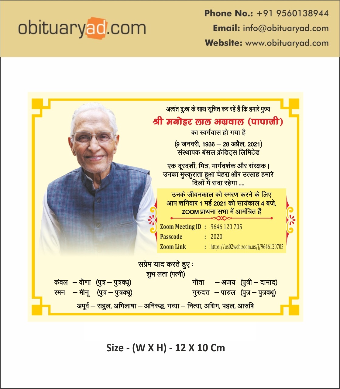 For quick assistance, call our Times of India Obituary Ad Booking Helpline at +91 95601 38944.